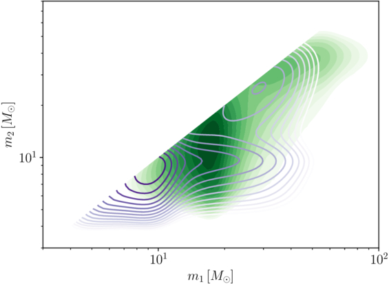 Two-dimensional mass distributions of the main population and subpopulation. Colors are the same as in all previous figures.