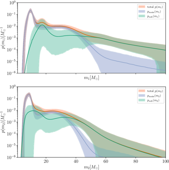 Marginal primary (top) and secondary (bottom) mass distributions. These produce similar conclusions to those presented in Section 5.