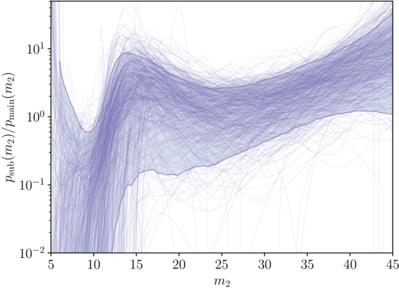 Ratio of the subpopulation’s 1G mass distribution, representing 1G BHs that merge in clusters, to the main population’s mass distribution, which consists of 1G BHs in clusters as well as all other binary formation scenarios. Horizontal lines on this plot would indicate that all BBHs originate in the same population of star clusters that produce 2G+1G mergers. However, a noticeable dip is present at ≈9M⊙, implying either that isolated binary evolution is required to fully explain the feature there, or that the clusters that produce our observed 1G+1G mergers differ from those that produce the 2G+1G population.