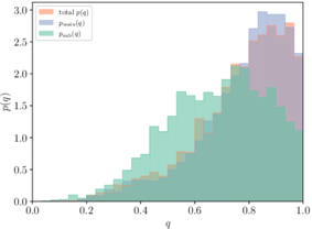 Mass ratio distributions, marginalized over hyperposterior uncertainty. The subpopulation’s mass ratio distribution is peaked at lower values than that of the main population, consistent with expectations for 2G+1G mergers. However, the value at which it peaks depends strongly on our choice of pairing function (see Figure 9).
