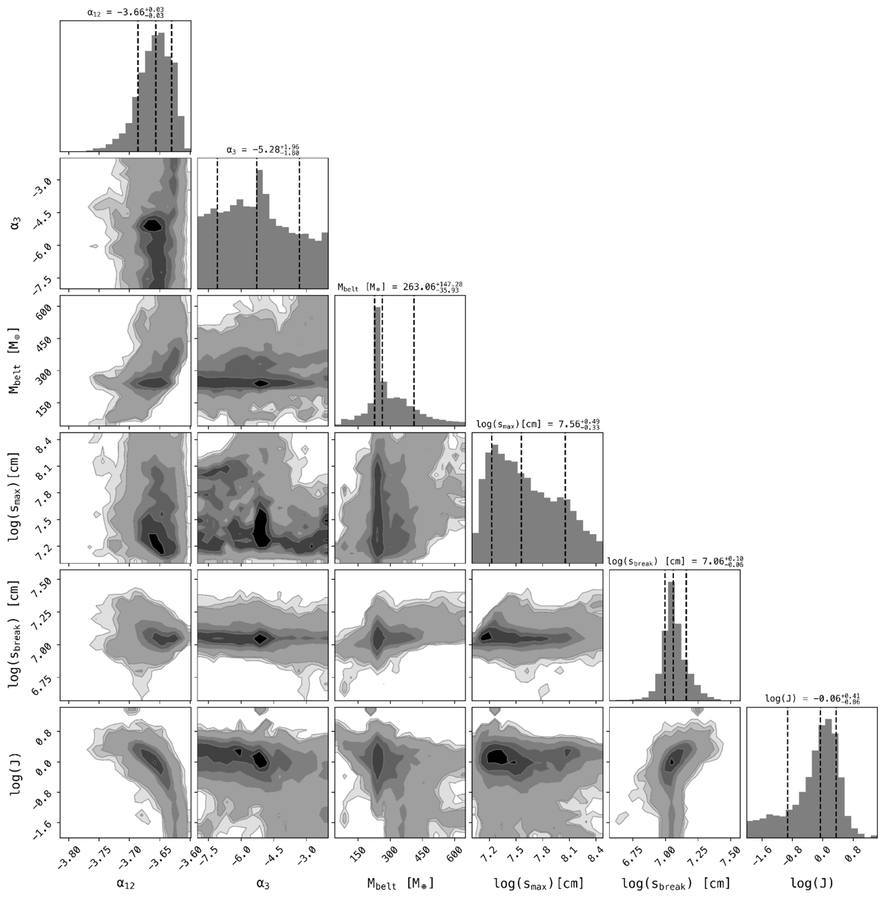 The posterior distribution of the emcee chain of the six parameters fit in our model for collisional progenitors with radii ≥100 km and including a smoothed/plateau surface density. The model is fit with 50 walkers, 10,000 steps, and 1000 burn-in steps. The dashed lines indicate the 16th, 50th, and 84th percentiles.