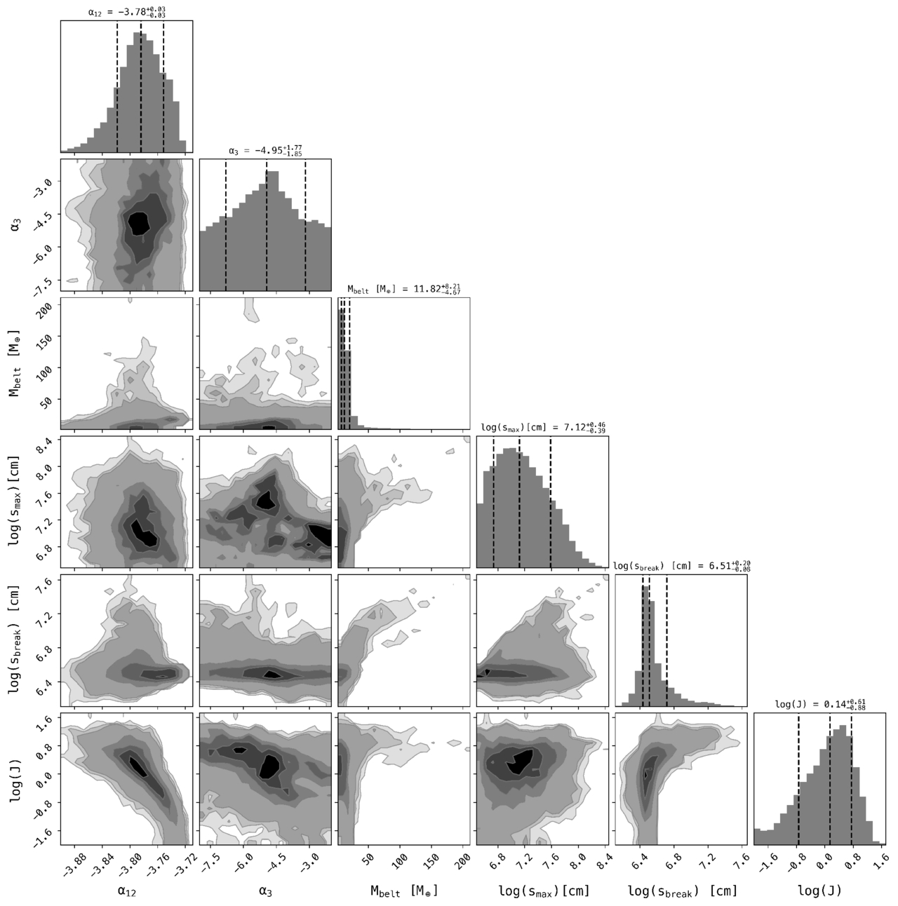 The posterior distribution of the emcee chain of the six parameters fit in our model for collisional progenitors with radii ≥30 km. The model is fit with 50 walkers, 10,000 steps, and 1000 burn-in steps. The dashed lines indicate the 16th, 50th, and 84th percentiles.