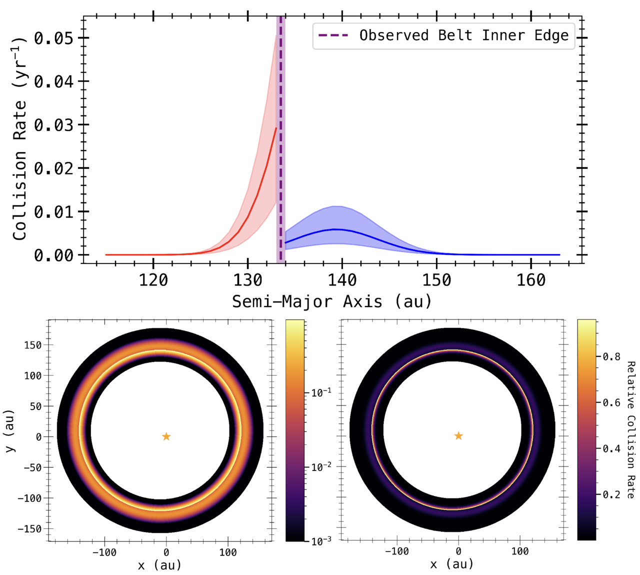 Top: the catastrophic collision rate for target planetesimals ≥100 km in radius as a function of belt semimajor axis. The blue region indicates the observed Fomalhaut main belt, and the red region indicates the region where Fomalhaut cs1 and cs2 originated, which is within the observed belt inner edge. We find the highest collision rate at the observed inner edge of the Fomalhaut main belt. The shaded regions indicate the 16th and 84th percentiles of the posterior distribution. We find a very low collision rate interior to 125 au owing to the low surface density of planetesimals in that region. We find a nonnegligible collision rate in the observed main-belt region. Bottom: belt schematics outlining the relative collision rate for target planetesimals ≥100 km in radius. The two images plot the same data, with the left panel showing a logarithmic scale and the right panel showing a linear scale. The brightest band in both images is the location of the observed belt inner edge and the location where the collision rate peaks. This is coincident with the discovery location of the most recent collision, Fomalhaut cs2.
