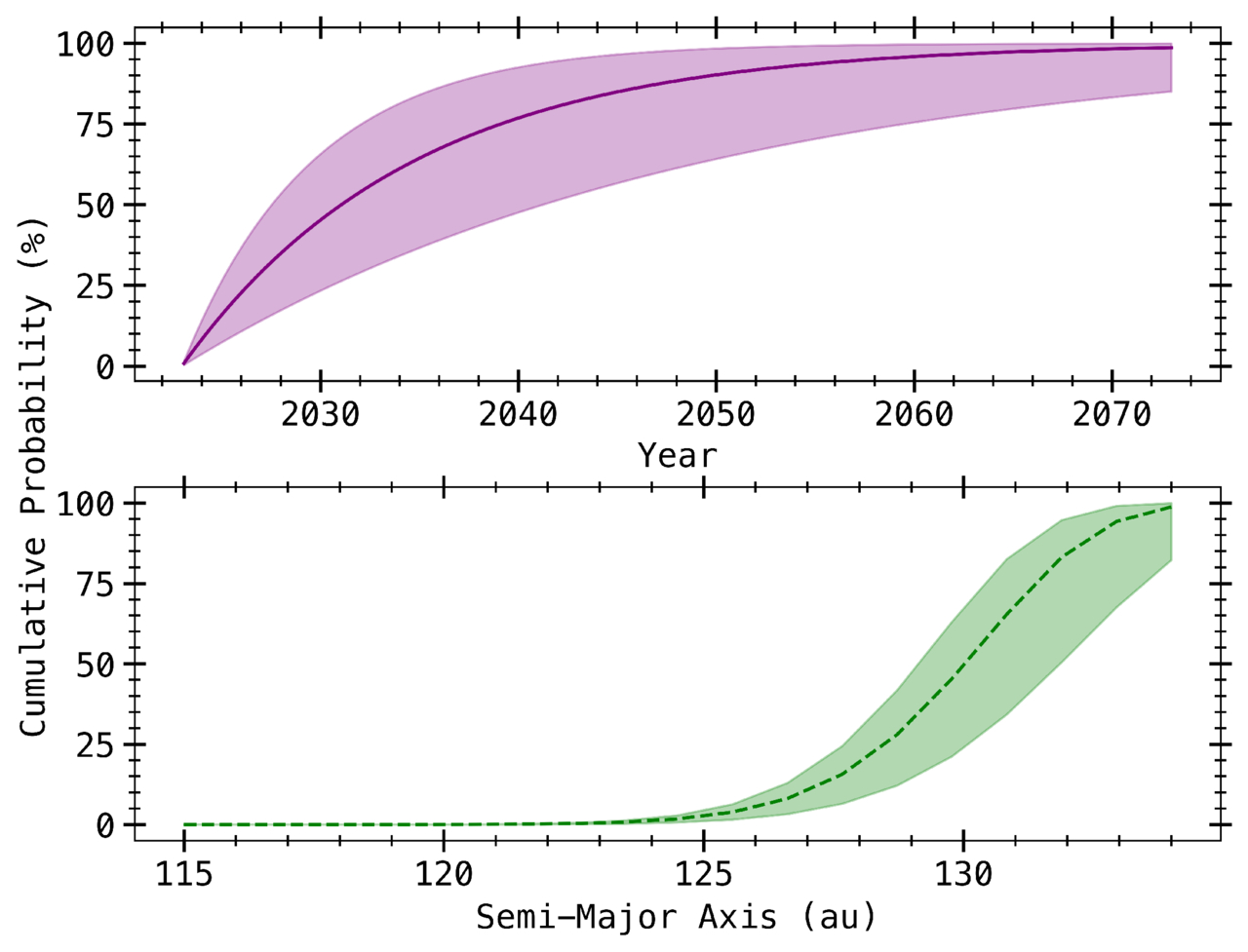 Top: the cumulative probability of the next collision event (a hypothetical Fomalhaut cs3) where the target planetesimal radius is ≥100 km in radius as a function of collision year under the conditions of our model (see Table 3). The shaded regions indicate the 16th and 84th percentiles of the posterior distribution. We find a 50% chance of the next collision occurring in 2027 at the earliest and 2041 at the latest. Bottom: the cumulative probability of the next collision event (Fomalhaut cs3) where the target planetesimal radius is ≥100 km in radius as a function of belt semimajor axis.