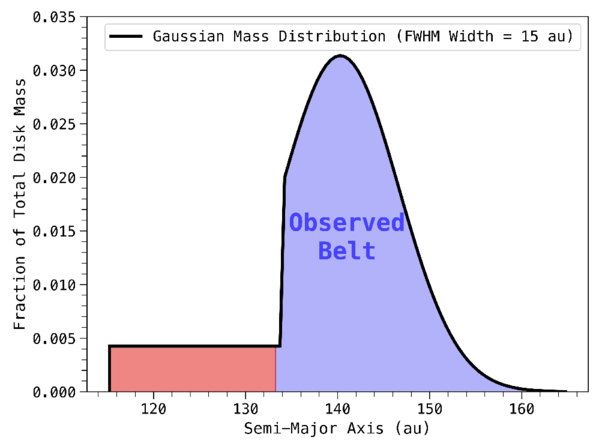 The fraction of the belt mass in each region of the disk as a function of belt semimajor axis, which is governed by a Gaussian surface density distribution in the dynamically cold, blue region and a smoothed/plateau surface density distribution in the dynamically hot, red region.