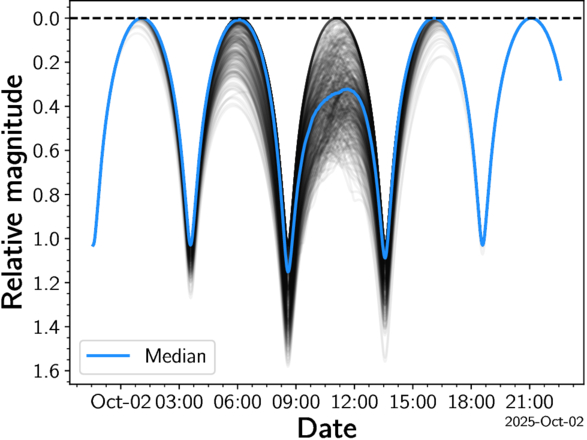 An example of the light curve of Altjira’s 2025 October 2 mutual event if the system has a contact-binary-like light curve. In contrast with Figure 2, we display all modeled light curves—even if they do not produce a mutual event. For this date, 96% of the 500 samples produce a mutual event.