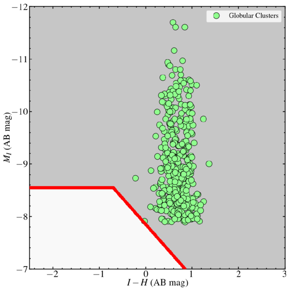 A color–magnitude diagram of a sample of GCs from J. P. Blakeslee et al. (2012) in I and H band compared with limits on a counterpart to GRB 230307A in F070W and F150W. The red line corresponds to our joint detection threshold to point sources in F070W and F150W, with the gray region containing detected point sources and the white region containing undetected point sources. We rule out nearly all of the GCLF, implying that it is extremely unlikely that the progenitor of GRB 230307A formed in situ in a GC.