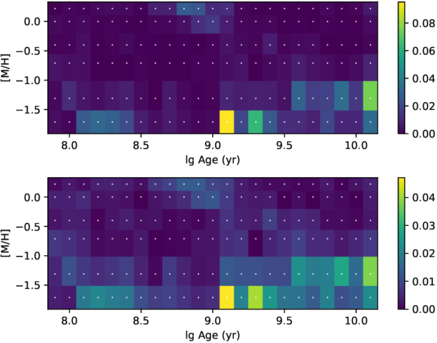 Top: distribution of the stellar pPXF weights, colored by the light-weighted fraction of different stellar populations with given age and metallicity. Bottom: standard deviation of pPXF weights after 500 iterations.