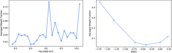 One-dimensional light-weighted distributions of stellar ages (left) and stellar metallicities (right), obtained from spectral fitting using pPXF.