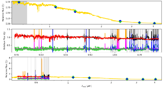 Fit used to estimate the spectral mass of the host galaxy. Top: best-fitting template using E-MILES templates shown as a golden line. Blue points with error bars indicate photometric measurements from JWST. The gray area corresponds to the wavelength range covered by the MUSE spectrum shown in the middle panel. Middle: observed spectrum in black, pPXF best-fitting total spectrum in orange, emission lines in magenta, masked outliers in blue, and residuals indicated with green diamonds. Bottom: combined spectra and photometric measurements.