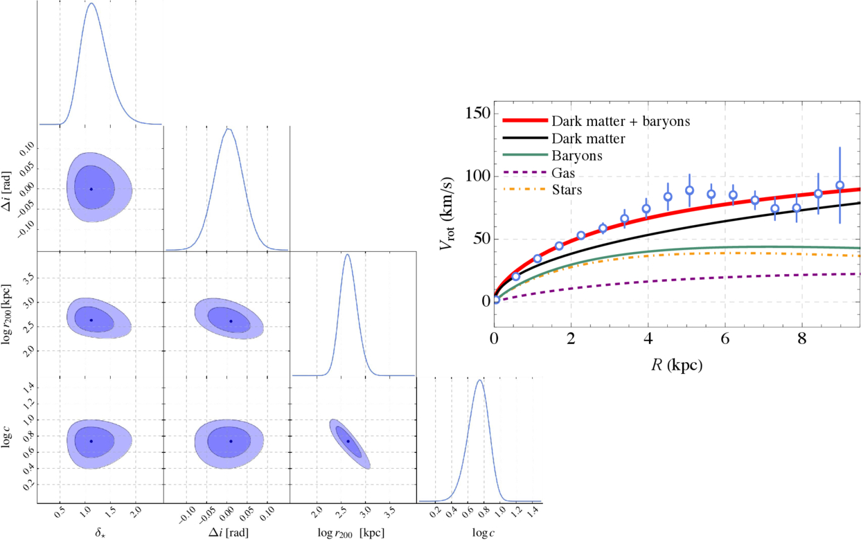 Left: marginalized 2D and 1D sections of the posterior distribution for the fitted parameters. In the 2D regions, the contours indicate the 1σ and 2σ credible regions, and the black circle marks the mode of each marginalized case. Right: the best-fit (MAP) rotation curve with an NFW dark matter halo (﹩{\delta }_{\star }=1.10,\,{\rm{\Delta }}i=0.01,\,\mathrm{log}c=0.75,\,\mathrm{log}({r}_{200}/\,\rm{kpc}\,)=2.64﹩).