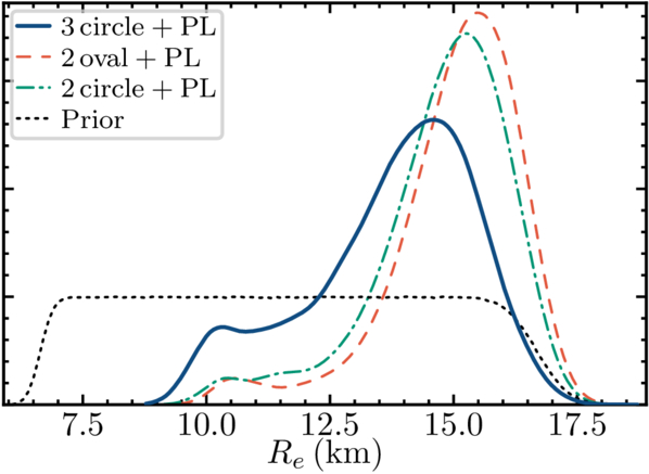 Radius posteriors for each of our three models with a modulated power law (the vertical axis is linear in the probability density); from top to bottom in the legend, the model numbers are 5, 4, and 3. The dotted line shows the prior. There is a large overlap of the posteriors of all three models, which shows that among the models with a modulated power law, the posterior is not especially sensitive to the model chosen.