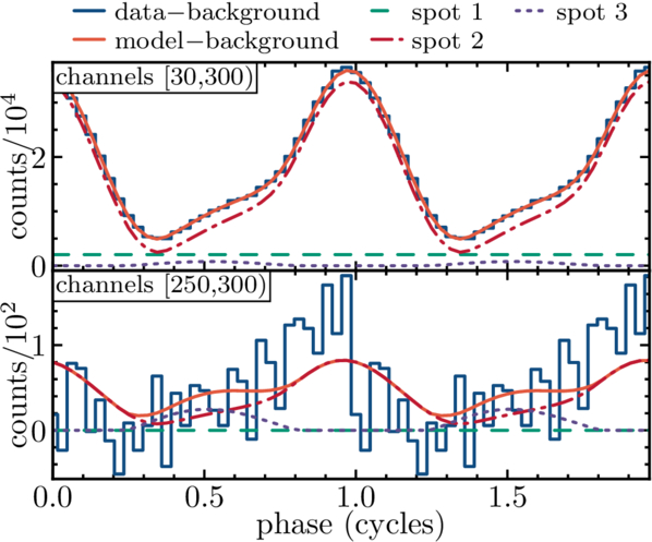 The same as Figure 10 but for the best three-circle fit that does not include a modulated power-law component. Because the spectral contribution from the modulated power law does not exist in this fit, the total background must account for these counts, and thus the data minus background and model minus background count totals are lower than they were in Figure 10. We also see that, without the modulated power law, the fit in the higher-energy channels is considerably worse than it was in Figure 10.