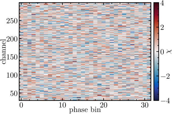 Phase-channel residuals for the best fit to the data of our model with three uniform-temperature circular spots plus a modulated power law, over the full set of 32 uniformly spaced rotational phases and NICER PI channels 30–299 inclusive. Here, for a phase-channel bin i, if the data have di counts and the model predicts mi counts, we define ﹩\chi \equiv ({m}_{i}-{d}_{i})/\sqrt{{m}_{i}}﹩. In addition to the fit having an overall acceptable χ2/dof = 8335.00/8345 (for which the probability of this χ2 or higher for a correct model is 53%), there are no patterns visible and no individual phase-channel bins with an unexpectedly large ∣χ∣. This is a one-way test: our satisfactory fit does not guarantee that the model is correct, but a very low probability would indicate that we would need to look more closely at our model.