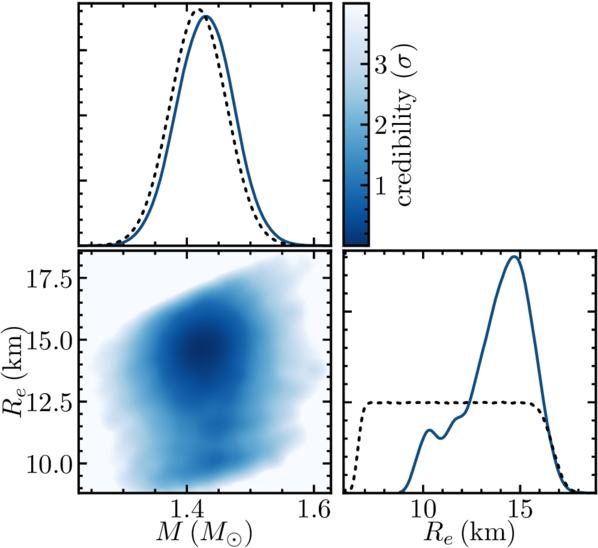 Mass and radius posteriors, using our best fit to the data of our model with three uniform-temperature circular spots plus a modulated power law—i.e., our Model 5. The dotted lines show the priors. The approximate upper diagonal boundary in the mass–radius plot corresponds to our c2Re/(GM) = 8 prior upper limit, whereas the approximate lower boundary is set by the likelihood rather than by our prior c2Re/(GM) = 3.2 lower limit. The mass posterior is single-peaked and is shifted only slightly from the tight prior given by radio observations, whereas the radius posterior is bimodal (with a larger mode at higher radii).