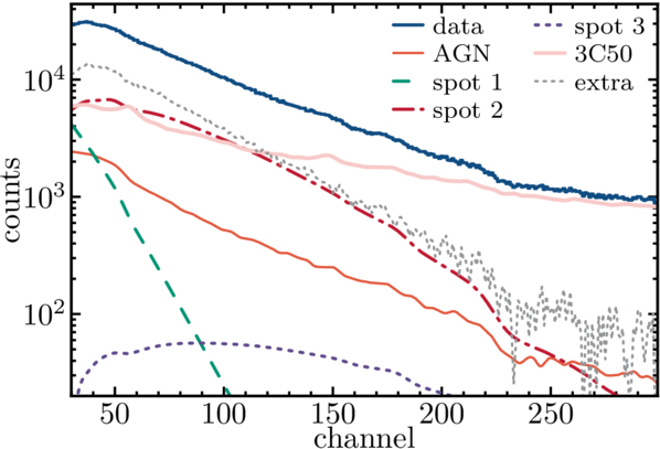 The same as Figure 8 but for the best three-circle fit with no modulated power law. Note that the spots have exchanged roles, e.g., Spot 1 is now the lowest-temperature spot. The overall fit to the spectrum is as good as the fit with a model including a modulated power law, because of the flexibility that we assume in the extra unmodulated background. However, because of the lack of the modulated power-law component, the extra background has more counts.