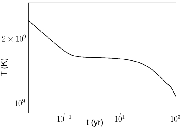 Thermal evolution of the hyperactive magnetar. At early times, the temperature drops rapidly due to neutrino cooling (ambipolar heating is inefficient at high T because collisional coupling inhibits the plasma motion relative to neutrons). At 0.1 yr ≲t ≲ 400 yr, ambipolar heating balances neutrino cooling so that T ≈ const. At late times, the magnetic energy available for dissipation decreases, so ambipolar heating declines, and neutrino cooling again dominates.