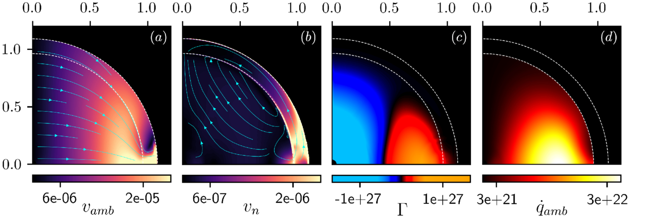 Snapshot of ambipolar diffusion at t = 200 yr. (a) Relative velocity between plasma and neutrons (ambipolar diffusion velocity) vamb in units of cm s−1. (b) Neutron velocity vn in units of cm s−1. (c) Rate of β-reactions Γ in units of s−1 cm−3 (red corresponds to neutron production, and blue corresponds to electron–proton production). (d) Ambipolar heating rate ﹩{\dot{q}}_{\mathrm{amb}}﹩ in units of erg s−1 cm−3. The axes are the same as in Figure 1. The dashed white curves are the contours of ρ = ρcore and ρ = ρdrip. The animation of this figure shows the sequence from t = 0–700 yr. The animation real-time duration is 15 s.