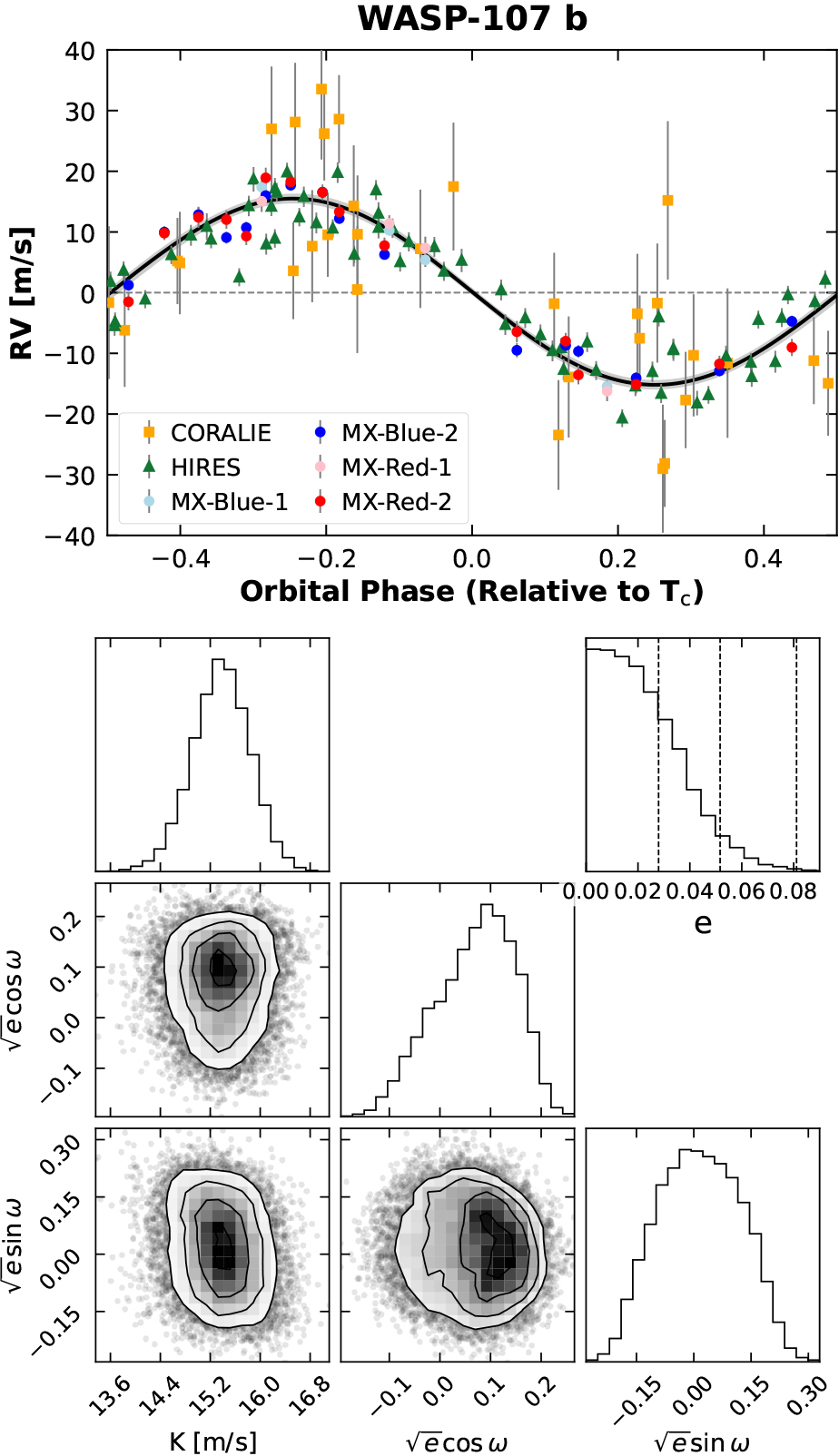 Same as Figure 1, but for WASP-107. In the top panel, the RV variation due to the outer planet WASP-107 c has been subtracted from the data.