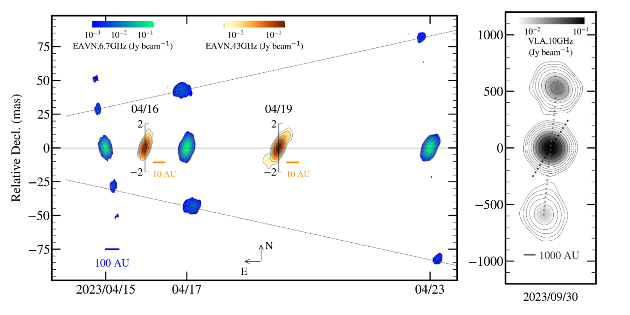 Large misalignment of position angles between continuous jets and discrete ejecta in GRS 1915+105. Radio images are obtained by the East Asian VLBI Network (EAVN) in the left and the Karl G. Jansky Very Large Array (VLA) in the right, with the image parameters summarized in Table 2. At the distance of GRS 1915+105 (∼9.4 kpc), 1 mas corresponds to 9.4 au here. The two-sided blobs at both 6.7 GHz of EAVN and 10 GHz of VLA are recognized as discrete ejecta. The extended structure at 43 GHz of EAVN and the center of VLA are continuous jets. The FWHMs of synthesized beams are around 6 mas × 3 mas and 0.9 mas× 0.5 mas for the EAVN at 6.7 GHz (blue) and 43 GHz (red), respectively. It is about 160 mas× 150 mas for the VLA at 10 GHz (gray). Contours in the three frequencies start at 4 times the image rms noise levels of 0.8, 5.0, and 0.3 mJy beam−1, respectively, and increase by factors of 2. The PA directions of the main two-sided ejecta (S1 and N1) from EAVN images at 6.7 GHz: PA ∼192∘, ∼186∘, and ∼186∘ on 2023 April 15, April 17, and April 23, respectively. The dashed lines are linear fits to radial distances of the S1 and N1 components as a function of time (see Table 2). The apparent speeds are 6.50 ± 0.18 mas days−1 for S1 and 6.53 ± 0.19 mas days−1 for N1, respectively. Extrapolation further indicates that both components were ejected around MJD 60045. The PA of continuous jets from EAVN 43 GHz data: PA ∼158∘, and ∼146∘ on 2023 April 16 and 19, respectively; PA ∼174∘ and ∼148∘ for the discrete ejecta (S2 and N2) and center continuous jet are indicated by dotted lines from VLA 10 GHz data on 2023 September 30, respectively.