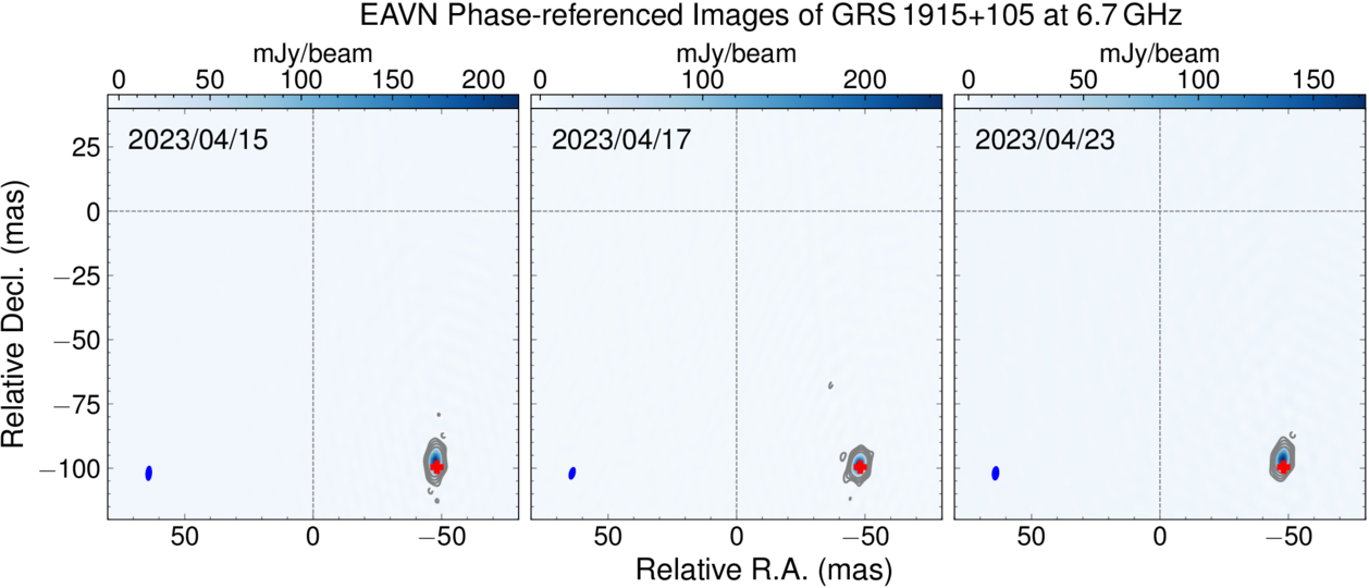Phase-referenced images of GRS 1915+105 observed with EAVN at 6.7 GHz on 2023 April 15 (left), 17 (middle), and 23 (right). Contours start at 0.5 mJy beam−1, increasing by factors of 2. The synthesized beam is indicated in the bottom-left corner of each panel. The J2000 coordinates of the map center (0,0) are (﹩1{9}^{{\rm{h}}}1{5}^{{\rm{m}}}11\mathop{.}\limits^{s}5473﹩, ﹩+1{0}^{\circ }5{6}^{{\prime} }44\mathop{.}\limits{^{\prime\prime} }7040﹩), corresponding to the source positions at an epoch within 2007–2008. The red cross marks the expected source position in 2023 (﹩1{9}^{{\rm{h}}}1{5}^{{\rm{m}}}11\mathop{.}\limits^{s}54409﹩ mas, ﹩+1{0}^{\circ }5{6}^{{\prime} }44\mathop{.}\limits{^{\prime\prime} }6044﹩ mas), extrapolated from proper motion estimates. These results suggest the detection of a bright, compact core of GRS 1915+105 in our phase-referenced images.