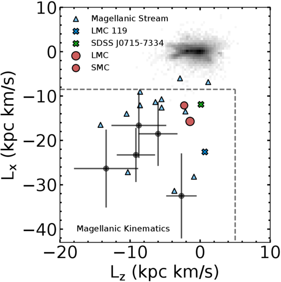The Galactocentric specific angular momentum in the Lx–Lz plane for our five CEMP stars (black circles) compared to other Magellanic system objects and the SDSS-V DR20 MINESweeper halo catalog (background gray density). The LMC (large red circle) and SMC (smaller red circle) have large negative Lx relative to the Milky Way halo, making this a prime kinematic quantity for isolating stars associated with the Magellanic system. The Magellanic Stream stars (light blue triangles) and the Magellanic kinematic selection box defined by Lx < −8.5 kpc km s−1 and Lz < 5 kpc km s−1 are taken from V. Chandra et al. (2023). We also show recently discovered ultra-metal-poor stars associated with the LMC: LMC 119 (blue cross) and SDSS J-715-7334 (green cross).