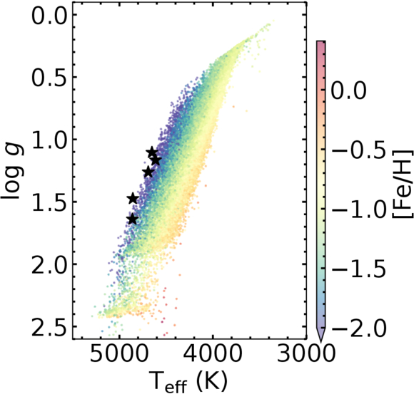 The MINESweeper stellar parameters for our five CEMP stars (black stars) relative to the rest of the SDSS-V DR20 Magellanic Genesis sample, which is colored by metallicity. The five stars lay on the hotter edge of the RGB, consistent with having some of the lowest metallicities in the sample.