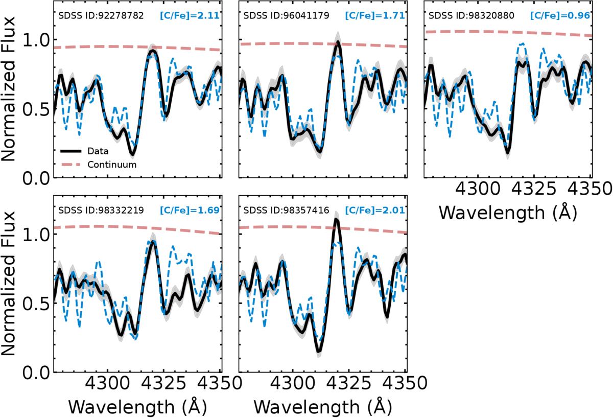 The fits to the CH G band for the five CEMP stars. The black line with the gray shaded region gives the observed normalized flux and the corresponding uncertainty. The blue dashed lines are the best-fit synthetic spectra. As the fit is highly sensitive to the continuum normalization, we fit the model continuum to best match the observed spectra. The red dashed line gives the continuum normalization for the best-fit carbon abundance model.