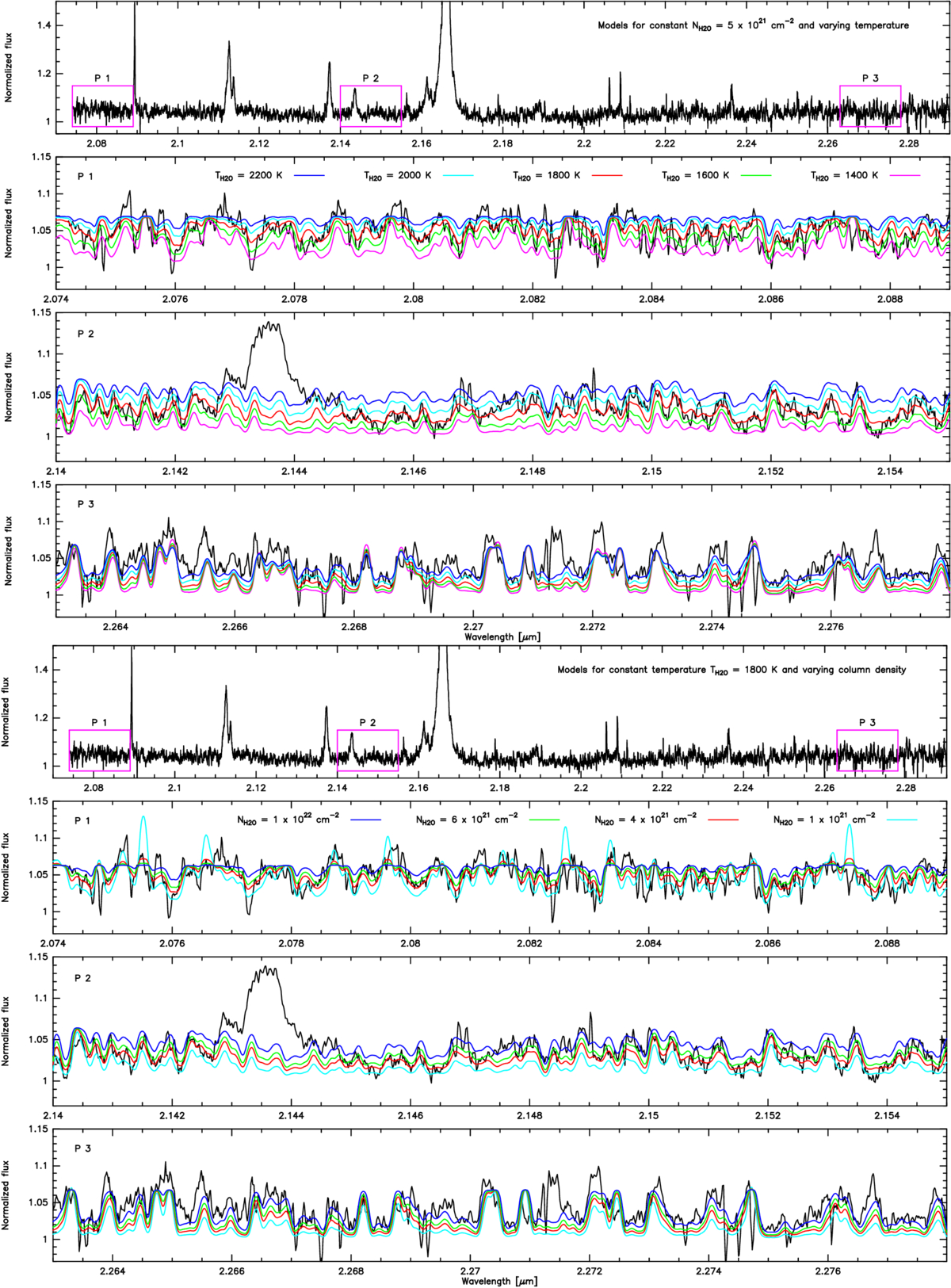 Different fits for selected portions of LHA 115-S 18 K-band spectrum, showing the variation with the model parameters: temperature and column density. The best fit is for T(H2O) ≈ 1800 K and N(H2O) ≈ 4–6 × 1021 cm−2.