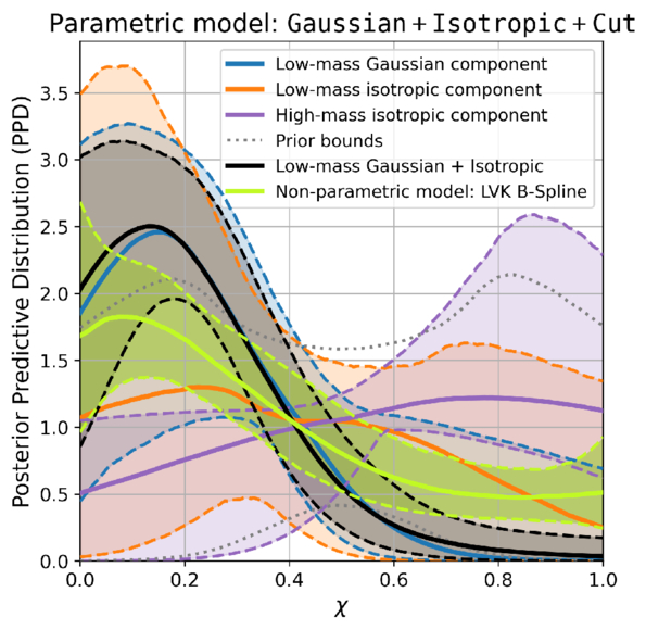PPD of the black hole spin magnitude distribution in the Gaussian Isotropic Cut model. Blue shows the magnitude distribution of the low-mass Gaussian component (parameterized by μχ and σχ), orange that of the low-mass isotropic component (﹩{\mu }_{\chi }^{{\rm{Iso}}}﹩ and ﹩{\sigma }_{\chi }^{{\rm{Iso}}}﹩), and purple that of the high-mass isotropic component (﹩{\mu }_{\chi }^{{\rm{HighIso}}}﹩ and ﹩{\sigma }_{\chi }^{{\rm{HighIso}}}﹩). The transition between low- and high-mass components is inferred at a primary mass cutoff of ﹩\tilde{m}\approx 44.{3}_{-4.6}^{+8.7}\,{M}_{\odot }﹩. The green color shows the nonparametric B-spline model of The LIGO, Virgo, and KAGRA Collaborations (2025a, 2025e ). Solid lines and shaded envelopes indicate medians and 90% credible intervals, respectively. The dotted lines show the prior bounds of the single-component models.