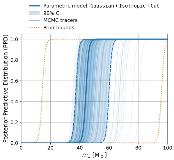 PPD of the cutoff Equation (4) in the Gaussian + Isotropic + Cut model. Blue shows the PPD for posterior draws of ﹩\tilde{m}﹩, and orange shows the 90% bounds for prior draws of ﹩\tilde{m}﹩ (uniform distribution ﹩{{ \mathcal U }}_{[10\,{M}_{\odot },100\,{M}_{\odot }]}﹩; see Section 2).