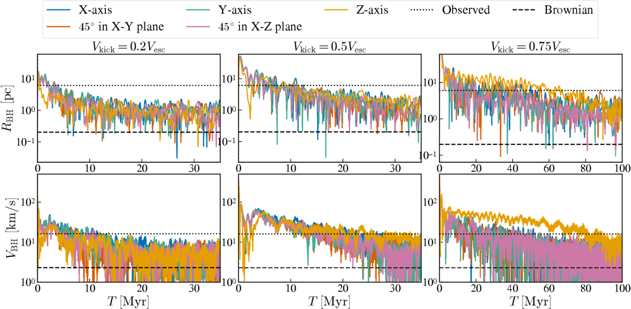 Trajectories of the BH that is kicked from the center of NGC 4486B. The different-colored curves represent kicks in different directions. The top panels show the BH’s relative distance from the galaxy center, and the bottom panels show its relative speed. The left and right panels correspond to kick velocities of Vkick = 0.2 Vesc, 0.5 Vesc, and 0.75 Vesc, respectively. The black dashed and dotted lines show the expected amplitude of Brownian motion and the observed offset in position and vlos, respectively. In all cases, the BH quickly returns close to the galaxy center, with position and velocity offsets that are well below the observed values.