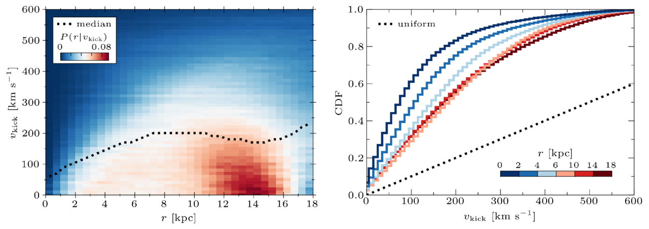 Distances of the kicked objects in the simulation of P. Disberg et al. (2025) for 40 Myr < t < 1 Gyr (evaluated with time steps of 1 Myr). The left panel shows, for each simulation containing 103 objects with a kick magnitude vkick, the distribution of distances to the Sun (r) in a 2D histogram with distance bins of 0.5 kpc and velocity bins of 10 km s−1. The rows are normalized so that the distribution corresponds to P(r∣vkick). The dotted line shows the median kick velocity in each distance bin. The right panel shows kick distributions integrated over certain distance ranges (colors) through Equation (1) for a uniform kick distribution between 0 and 1000 km s−1, along with that uniform distribution itself (dotted line), which is the kick distribution observed at t = 0 for any distance. We note that (1) the simulation considers kick velocities up to 1000 km s−1, even though the figure shows kicks up to 600 km s−1, and (2) vkick equals the natal kick for single objects but the systemic kick for binaries.
