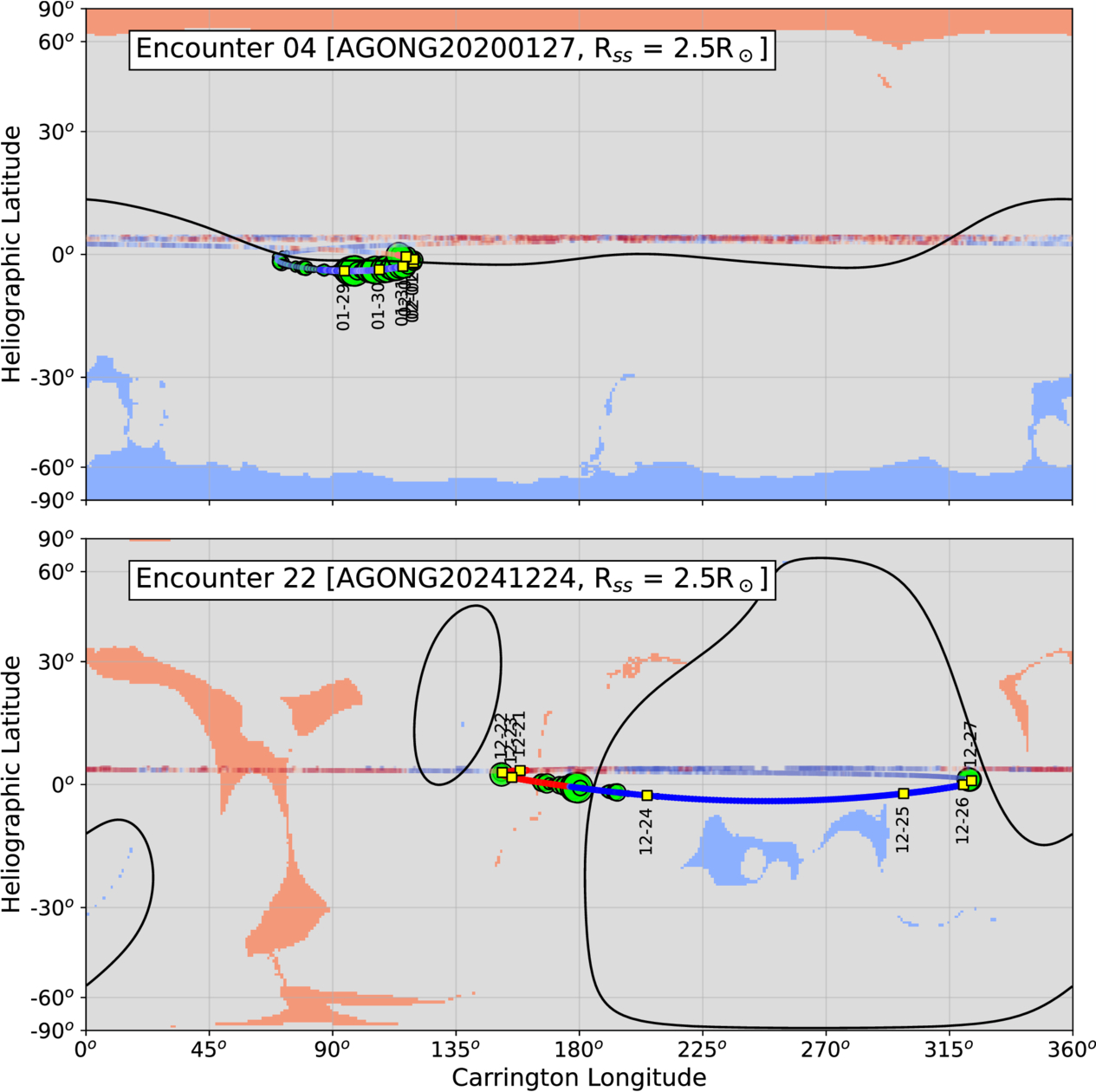 Heliographic projection to compare in situ BR field sign reversals to the hammerhead occurrence rate. Positive in situ BR is marked in red and negative in situ BR is marked in blue. The PSP trajectory (backmapped to 2.5R⊙) is colored by BR, where the perihelion is marked by higher opacity and larger markers. The fainter colored parts of the trajectory fall outside the dates we consider for the encounter, where we do not use hampy to detect hammerheads. We plot the fractional occurrence rate of the hammerheads as lime green circles in 1° bins in heliographic latitude–longitude. The sizes of these circles are proportional to the fraction of VDFs that get flagged as hammerheads in the specific latitude–longitude bin. The solid black line marks the HCS at 2.5R⊙ using PFSS. The top panel shows E04, while the bottom panel shows E22. The orange (blue) shaded regions indicate coronal holes formed by radially outgoing (incoming) open magnetic field lines.
