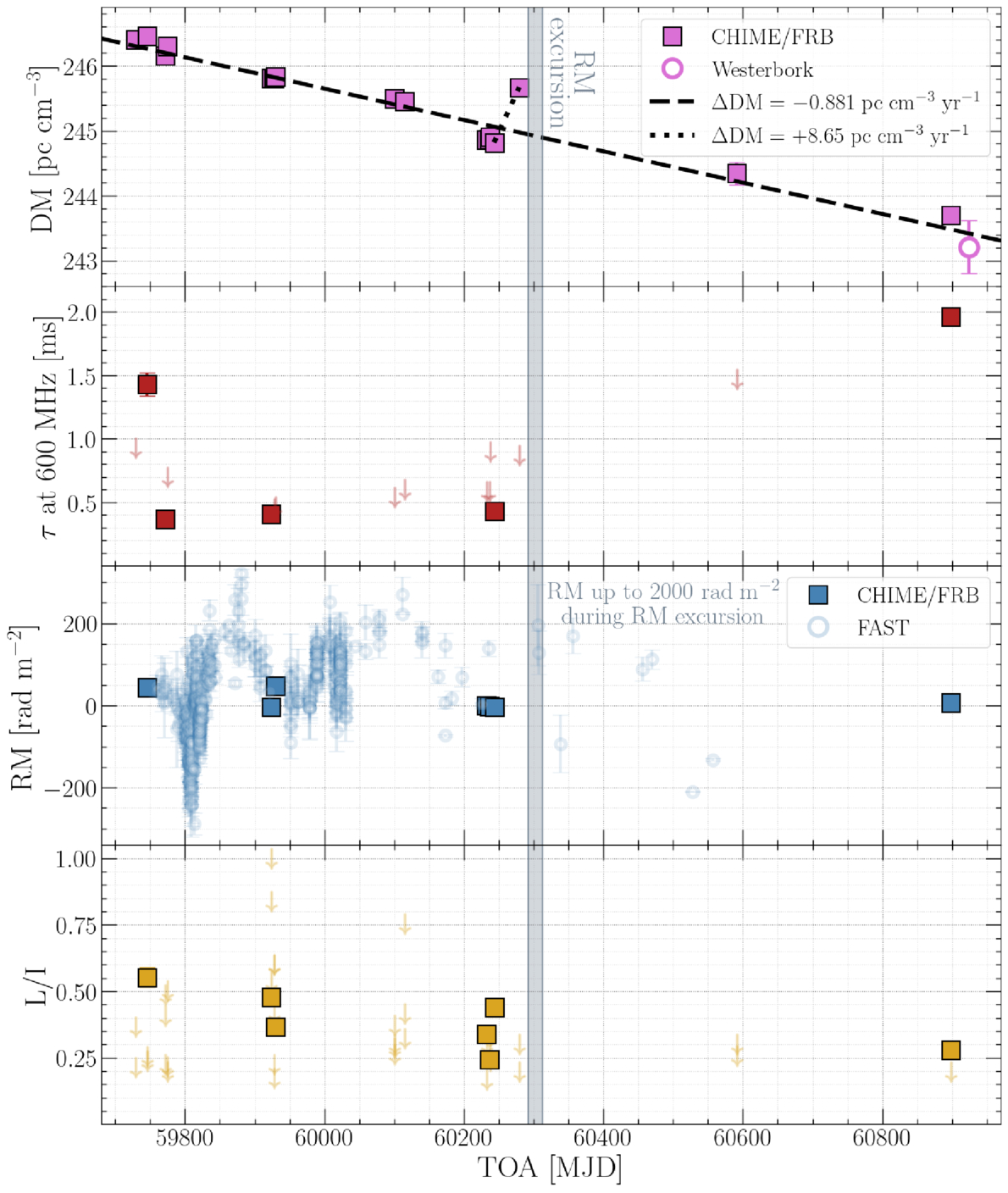 Temporal evolution of the DM, τ, RM, and L/I in FRB 20220529A as seen by CHIME/FRB (squares). Uncertainties in these parameters are smaller than the markers. The “RM excursion” (Y. Li et al. 2026) is shaded in gray. In the top panel, the best-fit decline in linear DM is plotted as a dashed line, and the slope of the rise in DM preceding the RM excursion is depicted with a dotted line. The DM of a burst detected by the RT-1 Westerbork radio telescope is plotted as an open purple circle. In the second and the bottom panels, upper limits on τ and L/I, respectively, are plotted as downward arrows. To show how the CHIME/FRB RMs fit into the broader RM evolution of FRB 20220529A, we overplot the FAST RM measurements by Y. Li et al. (2026) as blue open circles in the third panel; the RM excursion peak falls outside the y-axis range in this panel.