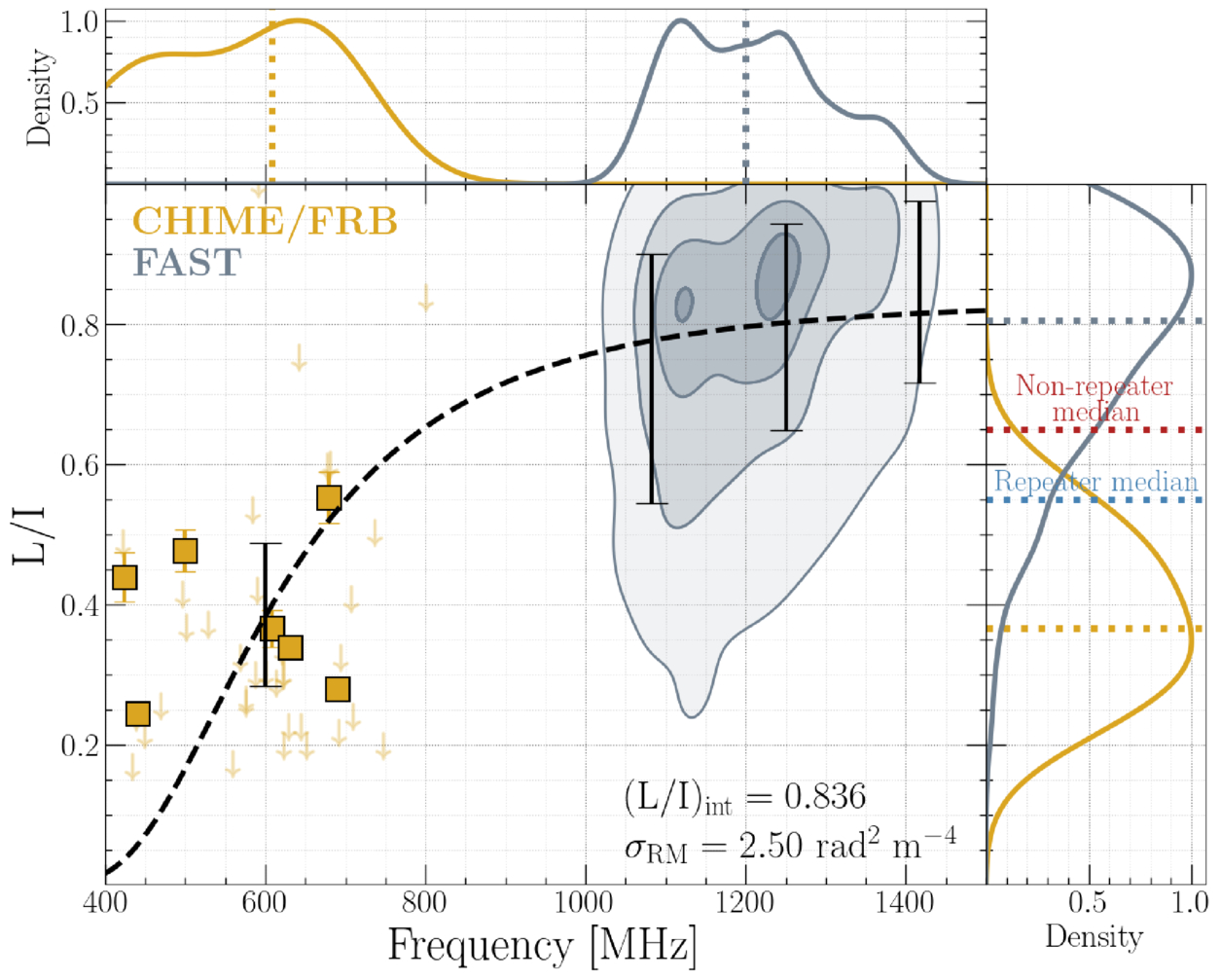 Linear polarization fraction vs. central frequency of FRB 20220529A bursts reported by CHIME/FRB and FAST. Polarized bursts observed by CHIME/FRB are plotted as gold squares, and L/I upper limits are shown as downward arrows. The large quantity of FAST observations is depicted as a gray density map with increasing opacity at discrete contour levels of 5%, 33%, 67%, and 95%, for visual clarity. Bursts during the RM excursion have been removed from the FAST data. The best-fit model is overplotted as a black dashed line, and the fit parameters are presented in the bottom right of the main panel. The binned L/I data on which the depolarization model was fit are plotted as vertical black bars centered on the mean binned values and spanning their standard deviations. Upper limits on L/I are not used in the depolarization model fitting. Smoothed kernel density estimates of the central frequency and L/I distributions for polarized bursts observed by each instrument are plotted in gold and gray, respectively, above and to the right of the main panel. Gold and gray dotted lines in these panels represent the medians of the corresponding distributions. Median L/I for polarized CHIME/FRB repeaters (C. Ng et al. 2025) and nonrepeaters (A. Pandhi et al. 2024) are overplotted as blue and red dotted lines, respectively, in the right-most panel.