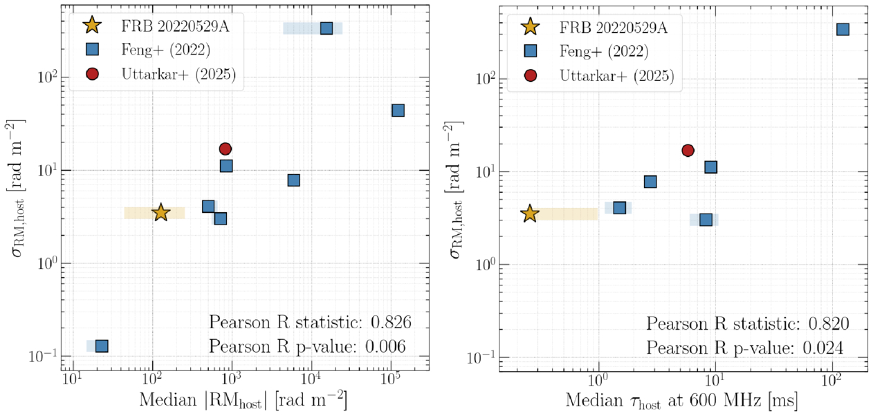 (Left) Rest-frame scatter in the observed RM, σRM,host, plotted as a function of median ∣RMhost∣ for FRB 20220529A and for other FRBs from the literature. (Right) Median rest-frame scattering timescale referenced to 600 MHz, where available, vs. σRM,host for the same FRBs. Gold and blue shaded regions represent the 68% confidence interval around the median ∣RMhost∣ and τ for FRB 20220529A and other repeaters, respectively. Uncertainties on σRM,host are smaller than the markers. The test statistics and p-values from Pearson R tests in both cases are presented in the bottom right of each panel.