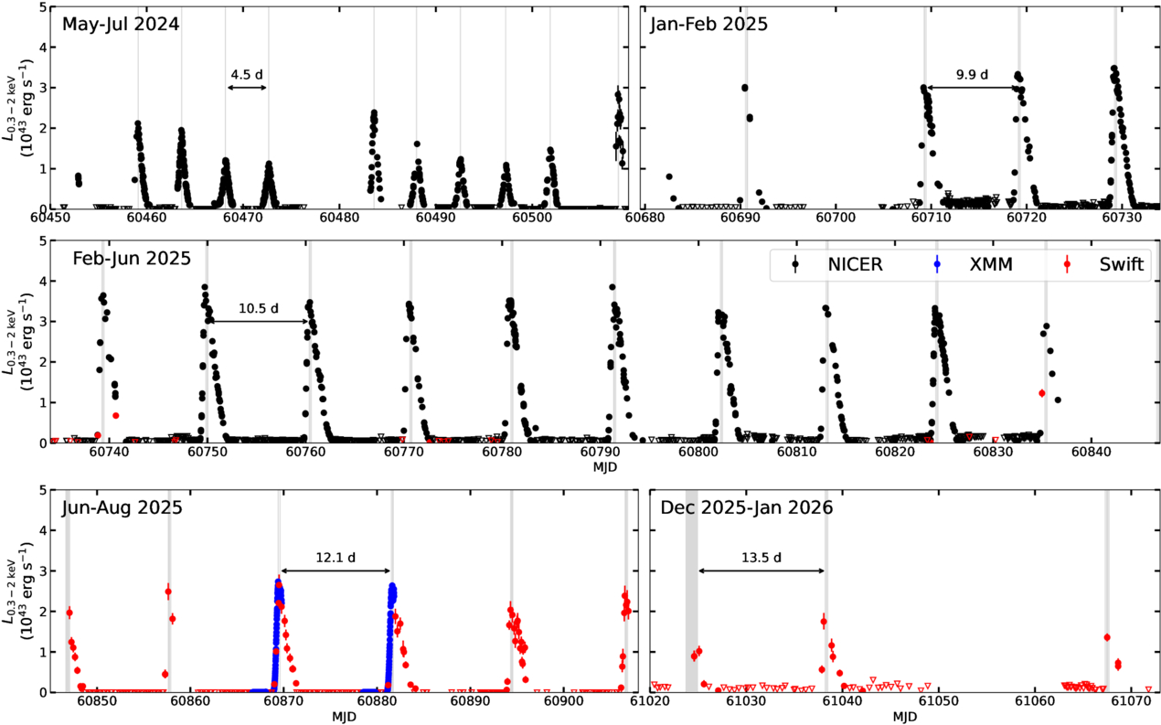 The soft X-ray light curve of Ansky from 2024 to 2026. Data were taken with the NICER (black), Swift (red), and XMM-Newton (blue) observatories. Gray shaded regions correspond to the ±1σ contours of tpeak measurements from our timing model (Table 1).