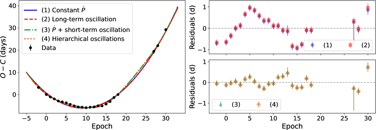 Left: O − C diagram of the QPEs overplotted with models 1–4. The data are consistent with P0 ≈ 9.5 days and ﹩\dot{P}\approx 1.7\times 1{0}^{-2}﹩ day day−1 at T0 ≈ 60710.1. In principle, it is possible that the apparent period increase is due to a long-term period oscillation observed locally (models 2 and 4); the > 1 yr data baseline over which ﹩\dot{P}﹩ is constant constrains any such oscillation to have a period ≳11 yr and amplitude ≳1000 days. Right: data−model residuals. Models 1–2 show structured residuals, which models 3–4 interpret as a sine with period ∼155 days and amplitude ∼0.8 days (though see Appendix).