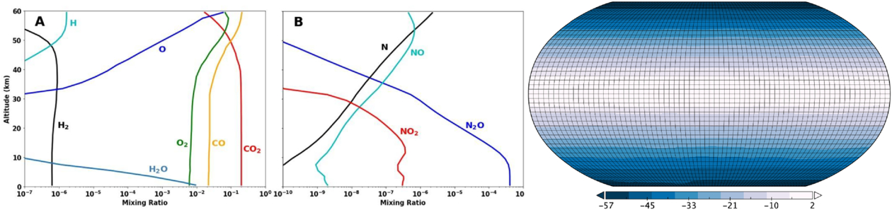 Panels (A) and (B): production rates of C and N-bearing molecules, including N2O. Right panel: the ROCKE-3D model GMST map due to the impact of 100 ppmv of N2O in the 99%N21%CO2 atmospheric composition of the early Earth or a rocky exoplanet receiving 75% of the current solar luminosity.