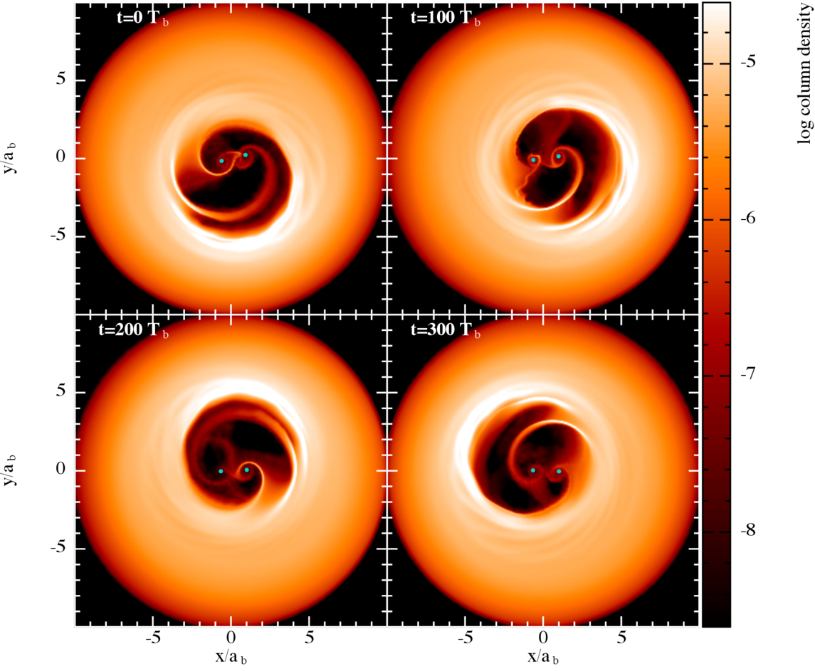 Series of snapshots showing the precession of the density enhancement at the apocenter of the eccentric inner disk edge. The snapshots are spaced by around 100 Tb, and the timescale for a full precession of the enhancement is ≈500 Tb for these parameters. The inner disk structure is not fixed, but varies through the binary orbit; this is shown in more detail in Figure 3.