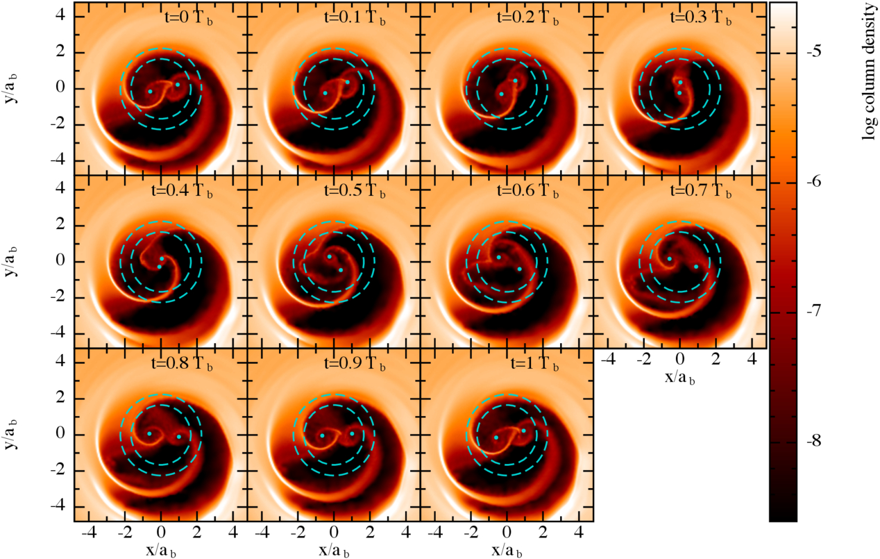 Series of snapshots showing the disk structural changes on short timescales as the binary completes an orbit. Each panel is separated in time by an interval of 0.1 Tb. The two cyan dashed circles indicate the location and FWHM of the azimuthal asymmetric ring modeled in T. Juhász et al. (2025). While the spiral streams can cross the location of the observed ring, the strong density enhancement associated with the inner edge of the circumbinary disk is at a significantly larger radius than the observed ring.