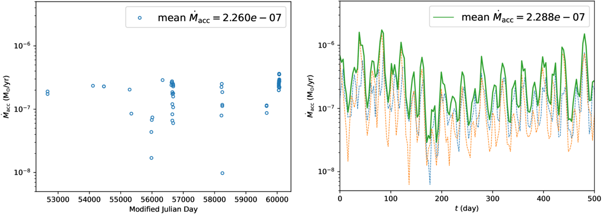 Left: the fitting results of ﹩{\dot{M}}_{{\rm{acc}}}﹩ of DX Cha across the 93 epochs shown as empty circles. Right: the new ﹩{\dot{M}}_{{\rm{acc}}}﹩ of DX Cha with the time in our simulations after we reduce the disk mass in our model from the original value given in the setup (Section 2) by a factor of ≈200. The blue and orange dashed lines represent ﹩{\dot{M}}_{{\rm{acc}}}﹩ of the primary and the secondary of DX Cha in the retrograde simulation, respectively. The green line is the total ﹩{\dot{M}}_{{\rm{acc}}}﹩.