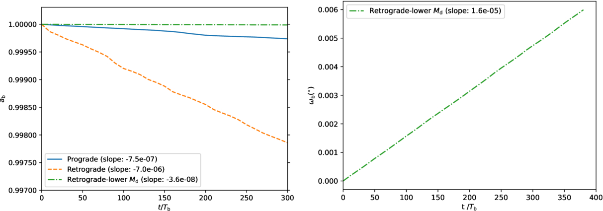 Left: ab vs. Tb for prograde (blue), retrograde (orange dashed), and retrograde with the lower Md (green dotted–dashed) cases. The slopes in the legend indicate the ﹩\dot{{a}_{{\rm{b}}}}﹩ rates for three simulations. Right: Time evolution of ωb for the retrograde disk simulation.