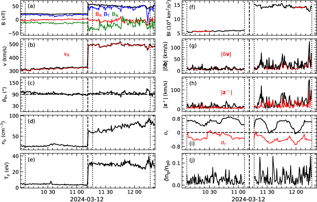 Overview of a quasi-perpendicular fast-forward Interplanetary shock observed by PSP on 2024 March 12. (a) Magnetic field strength and components. (b) Proton velocity and radial component. (c) Angle between magnetic field and proton velocity. (d) Proton density. (e) Proton temperature. (f) Bernoulli integral. (g) Amplitude of magnetic field fluctuations in Alfvén units and amplitude of velocity fluctuation. (h) Amplitude of Elsässer variables. (i) Normalized cross-helicity and normalized residual energy. (g) Normalized density fluctuation.