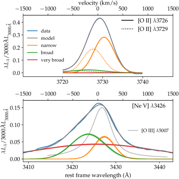 Kinematically consistent decomposition of [O II] and [Ne V] emission lines for the full sample. Both panels show dual x-axes in wavelength and velocity, with the velocity axes aligned for direct comparison. The observed profile is shown in blue, and each line is decomposed into “narrow” (orange), “broad” (green), and “very broad” (red) Gaussian components, whose widths and velocity shifts are tied between [O II] and [Ne V]. In the [O II] doublet (upper panel), the λ3726 and λ3729 lines are indicated by dotted and solid curves, respectively. For each component and for the total model (gray), 100 randomly drawn MCMC posterior samples are overplotted as semitransparent curves to illustrate the fitting uncertainties. In the lower panel, a scaled [O III] emission-line profile (light gray) is overplotted as a reference (see Section 5.1).