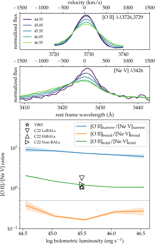 [O II] and [Ne V] line profiles and flux ratios as a function of bolometric luminosity. Upper and middle panels: observed [O II] and [Ne V] line profiles in five bolometric-luminosity bins, normalized to the same integrated flux to facilitate comparison of line widths and shapes. Lower panel: [O II]/[Ne V] flux ratios for narrow components (blue), broad components (orange), and total flux (green). Previous total-flux measurements from D. E. Vanden Berk et al. (2001; star) and Z. Chen et al. (2022; triangles) are shown for comparison. The triangles from Z. Chen et al. (2022) represent nonbroad absorption line quasars (non-BALs), high-ionization BALs (HiBALs), and low-ionization BALs (LoBALs). The horizontal dotted line marks the flux ratio of 0.5 predicted by CLOUDY for AGN photoionization.