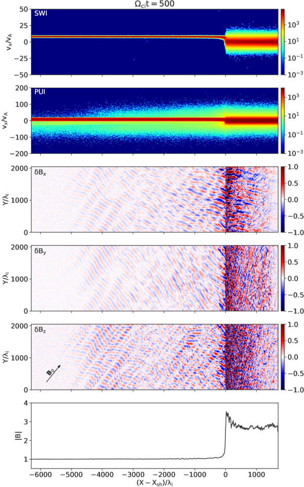 Snapshots at ΩciT = 500 showing the phase-space density of the solar wind and PUI components in the top two panels, the magnetic field fluctuations, δB, in the next three panels, and the averaged magnitude of the magnetic field, ∣B∣, in the last panel. The arrow corresponds to the direction of the background magnetic field, B0. The magnetic fluctuations are normalized by B0.