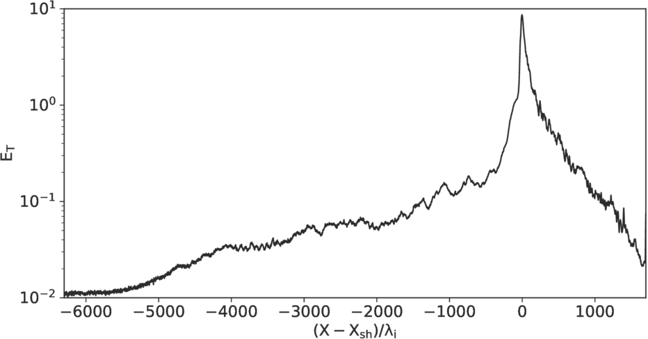 1D profiles of the total fluctuation energy, ﹩{E}_{T}=\lt \delta {v}_{e}^{2}\gt +\lt \delta {b}^{2}/4\pi \rho \gt ﹩, defined by the electron velocity fluctuations δve and ρ = mine, averaged over the Y-axis at ΩciT = 500. The total energy is normalized by ﹩{v}_{A}^{2}﹩.
