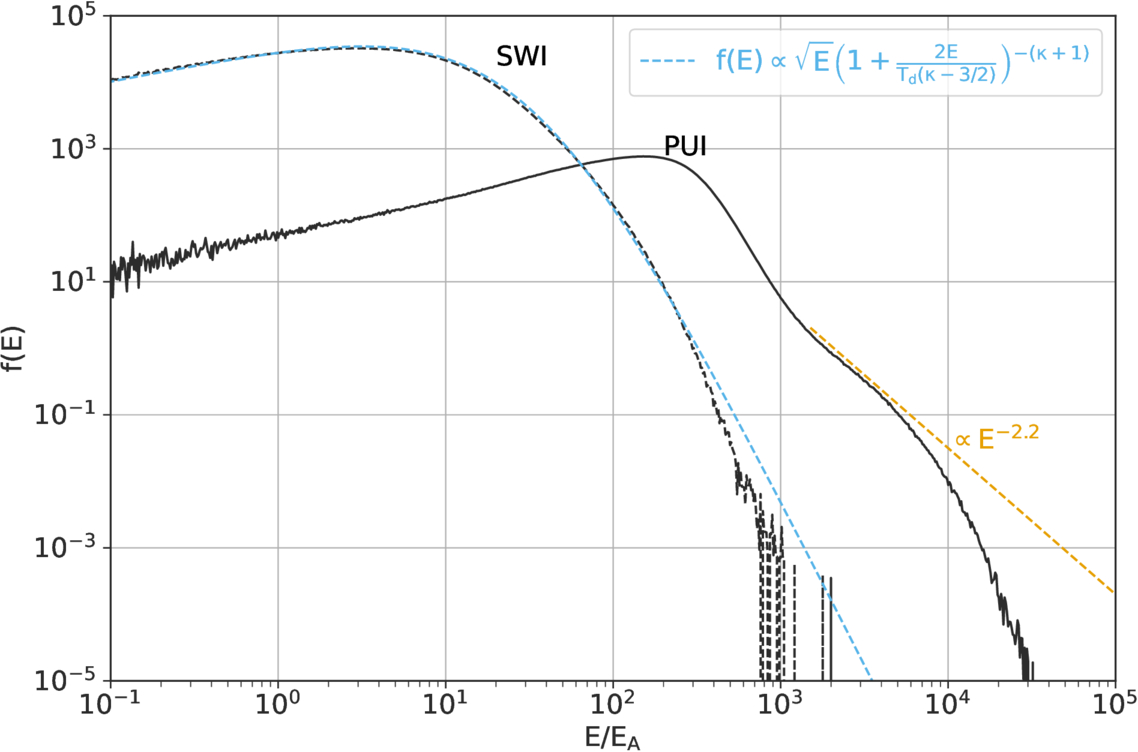 Energy spectra of the SWI (black dashed line) and PUI (black solid line) components integrated into the downstream region (X − Xsh = 0 to 1000λi) at ΩciT = 500. The energy is normalized by ﹩{E}_{A}=0.5{m}_{i}{v}_{A}^{2}﹩. The orange dashed line corresponds to a power-law distribution with a power-law index of −2.2. The blue dashed line is a kappa distribution. The kappa index κ is 4.5, and the downstream ion temperature Td is ﹩5.25{m}_{i}{v}_{A}^{2}﹩.